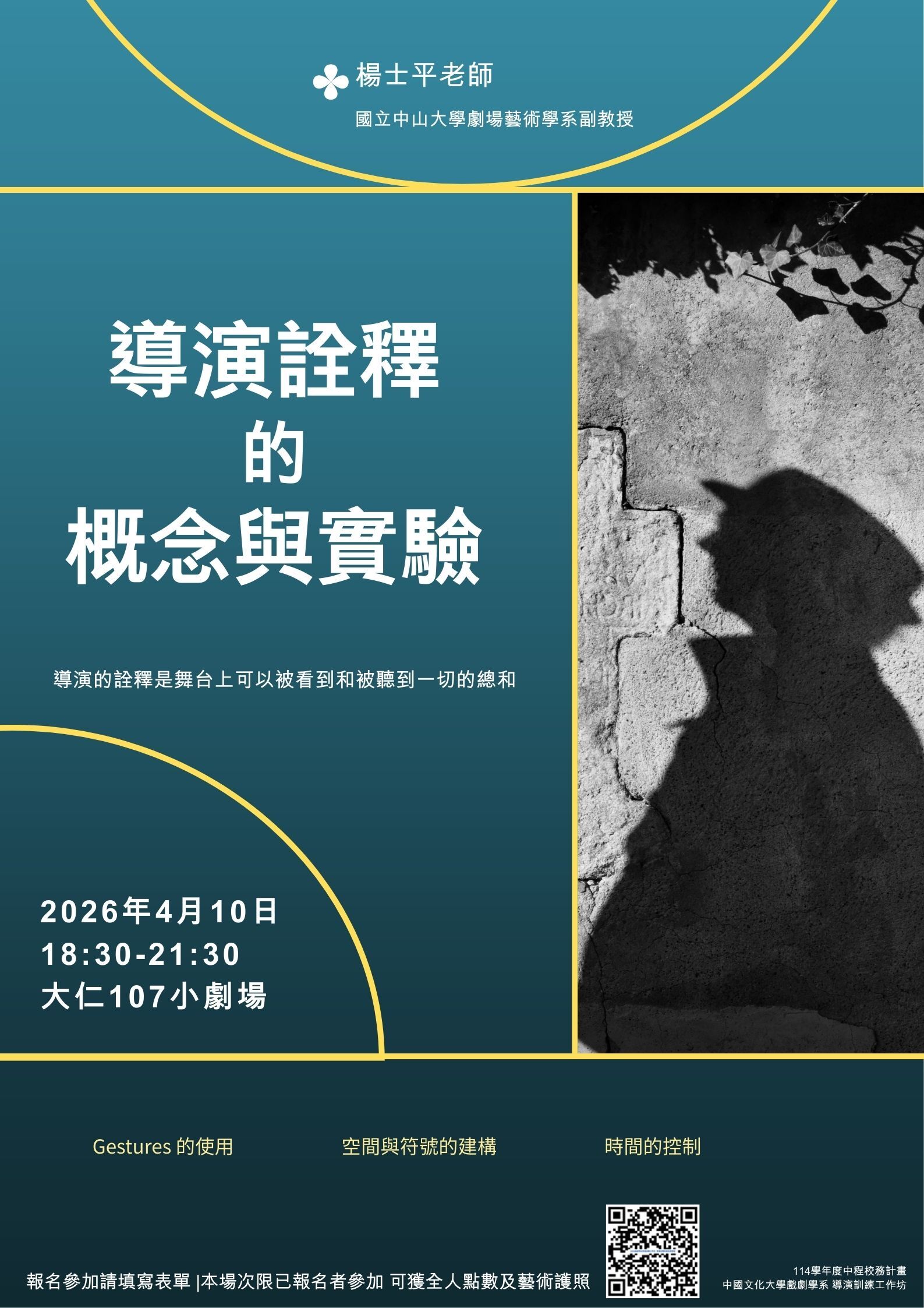 2026戲劇學系導演訓練工作坊- 導演詮釋的概念與實驗即日起開始報名